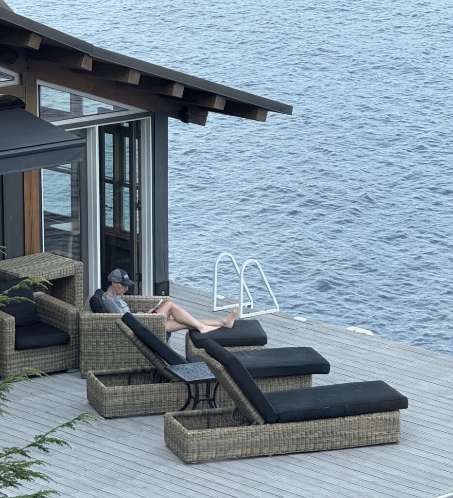 I did lots of that cutting at a friends’ cottage out in Muskoka this summer. One of the friends took a picture of me while I was sitting out by the lake, reading/editing WAVES.