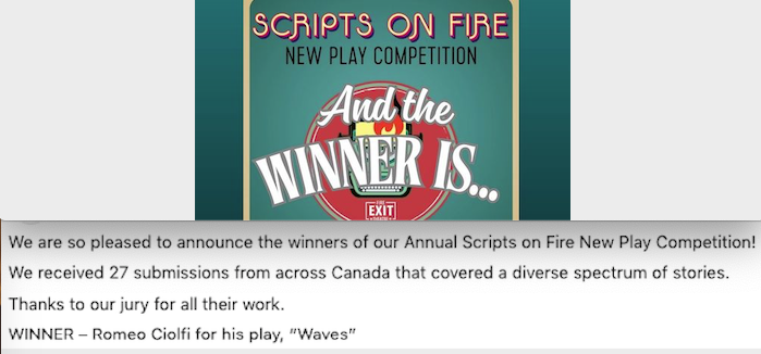 Fire Exit Theatre runs a play competition called Scripts on Fire.  I received a delightful email from Val Lieske (Founder and Artistic Director of Fire Exit) just after Christmas informing me that my play WAVES won their 9th Annual Scripts on Fire New Play Competition. You can read all about their annocement on Fire Exit’s INSTAGRAM POST.